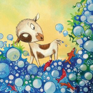 Tut-Tut ta bay baña den e plas di awa grandi pa prome biaha. E ta mira yen di blaas den awa, cu ta haci plop, plop, plop! Di unda nan ta bini?