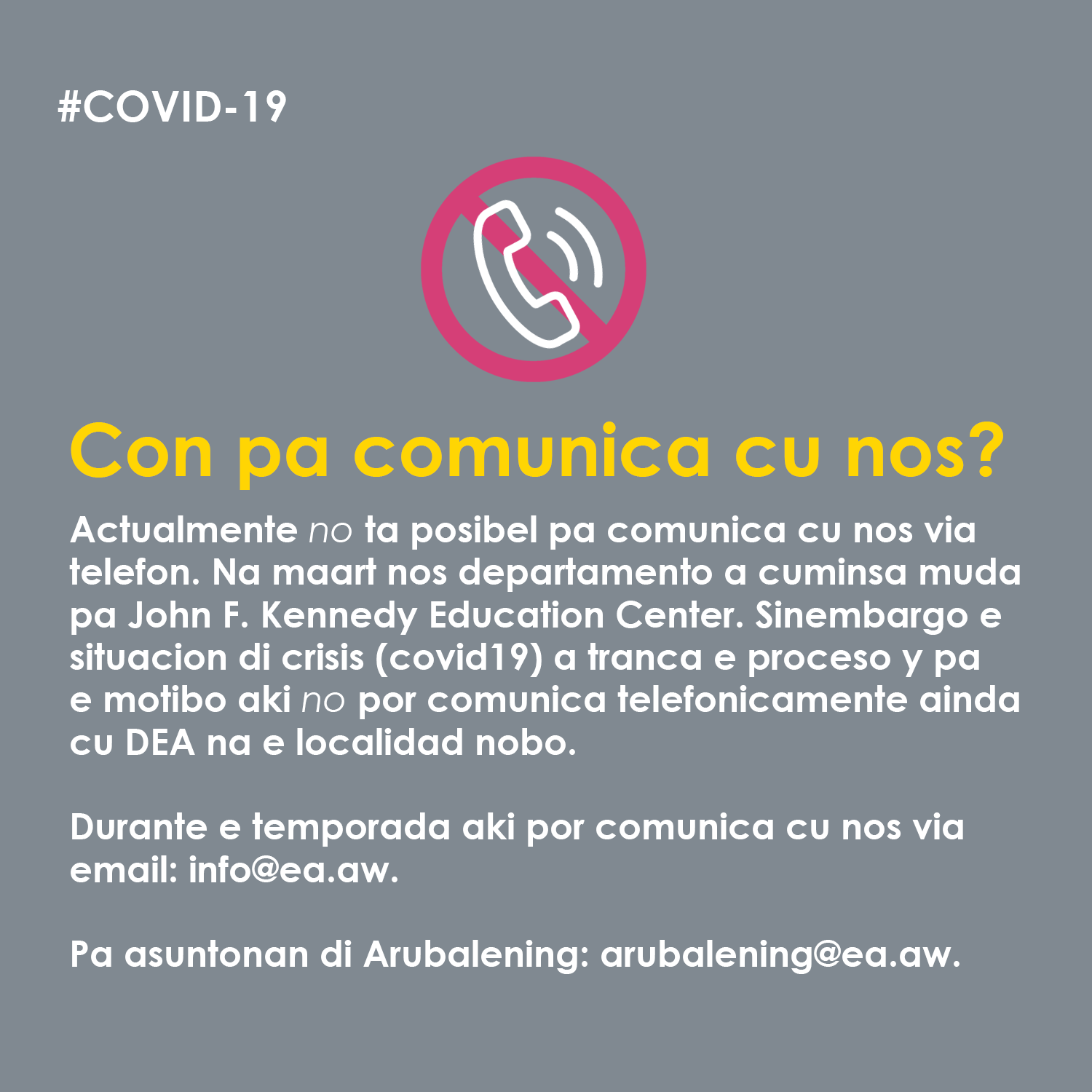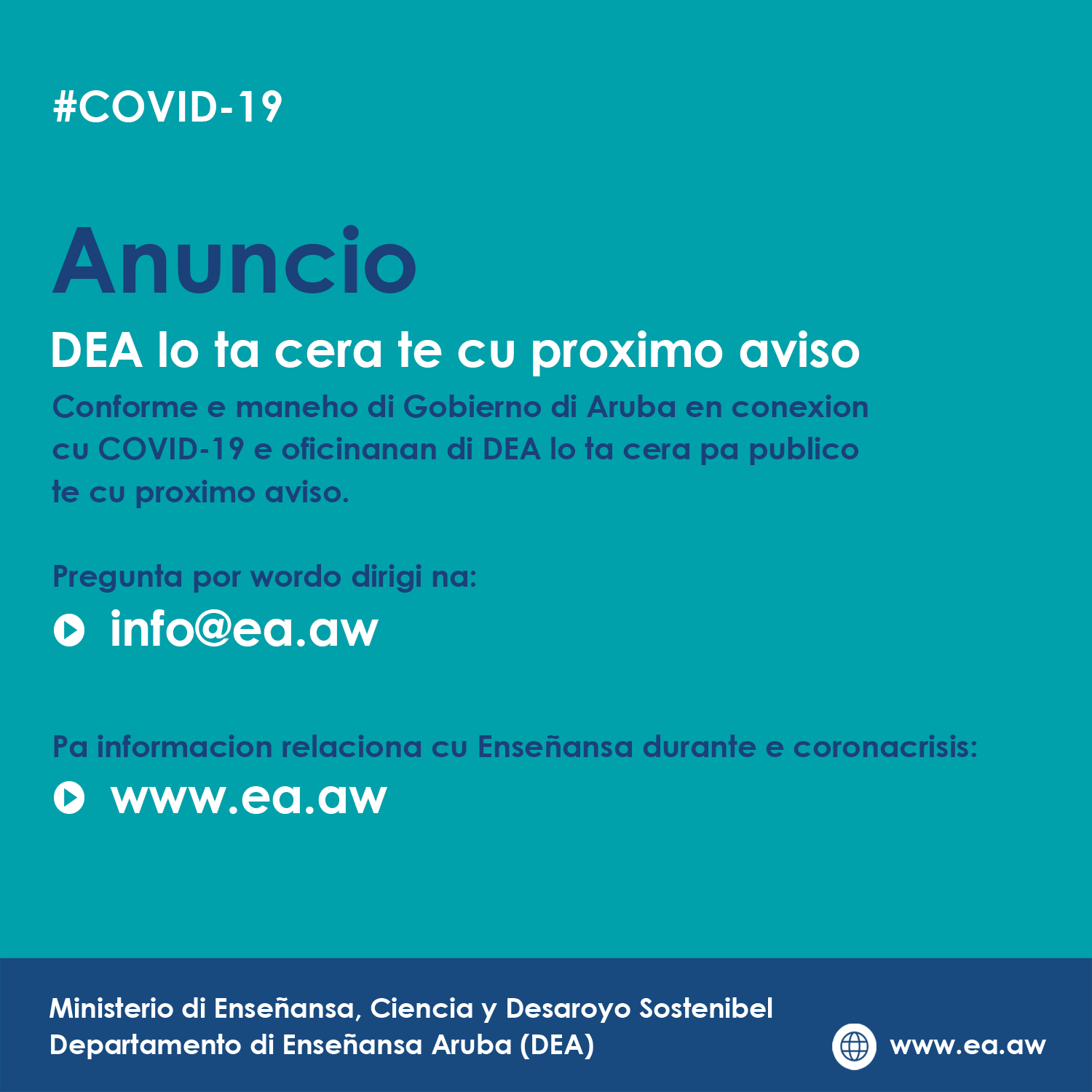 Conforme e desicionnan di Gobierno di Aruba en conexion cu e corona-crisis (COVID-19) e oficinanan di Departamento di Enseñansa Aruba (DEA) ta cera pa publico te cu proximo aviso.