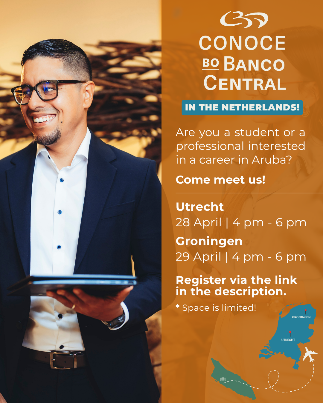 Banco Central di Aruba (BCA) lo ta na Hulanda! Nan ta organisando sesionnan di networking na Utrecht (28 di april) y na Groningen (29 di april) pa studiantenan y professionalnan cu ta interesa den un carera na Aruba.