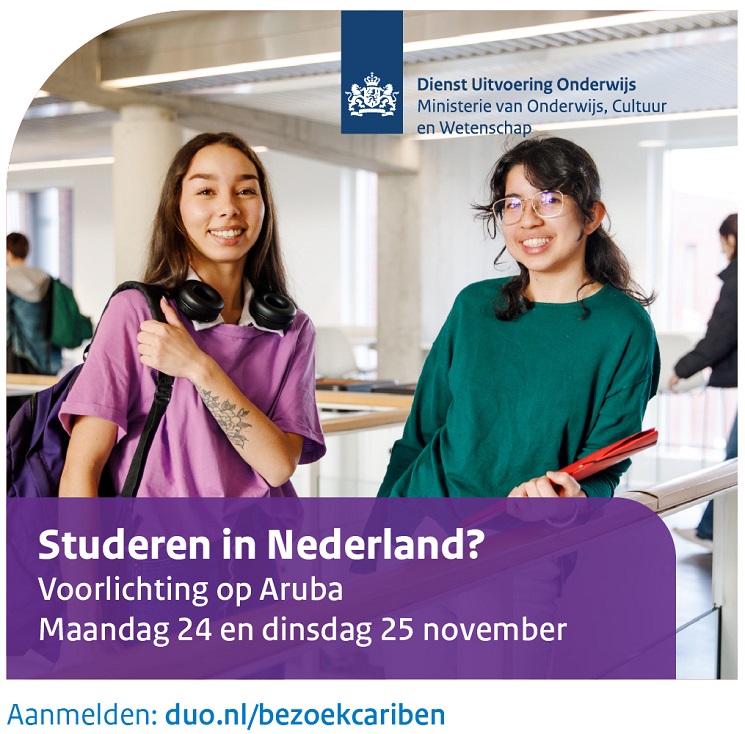 Bo ta planea pa studia na Hulanda e proximo aña escolar/academico? Dienst Uitvoering Onderwijs (DUO) ta invita bo pa inscribi pa un encuentro informativo na Aruba.